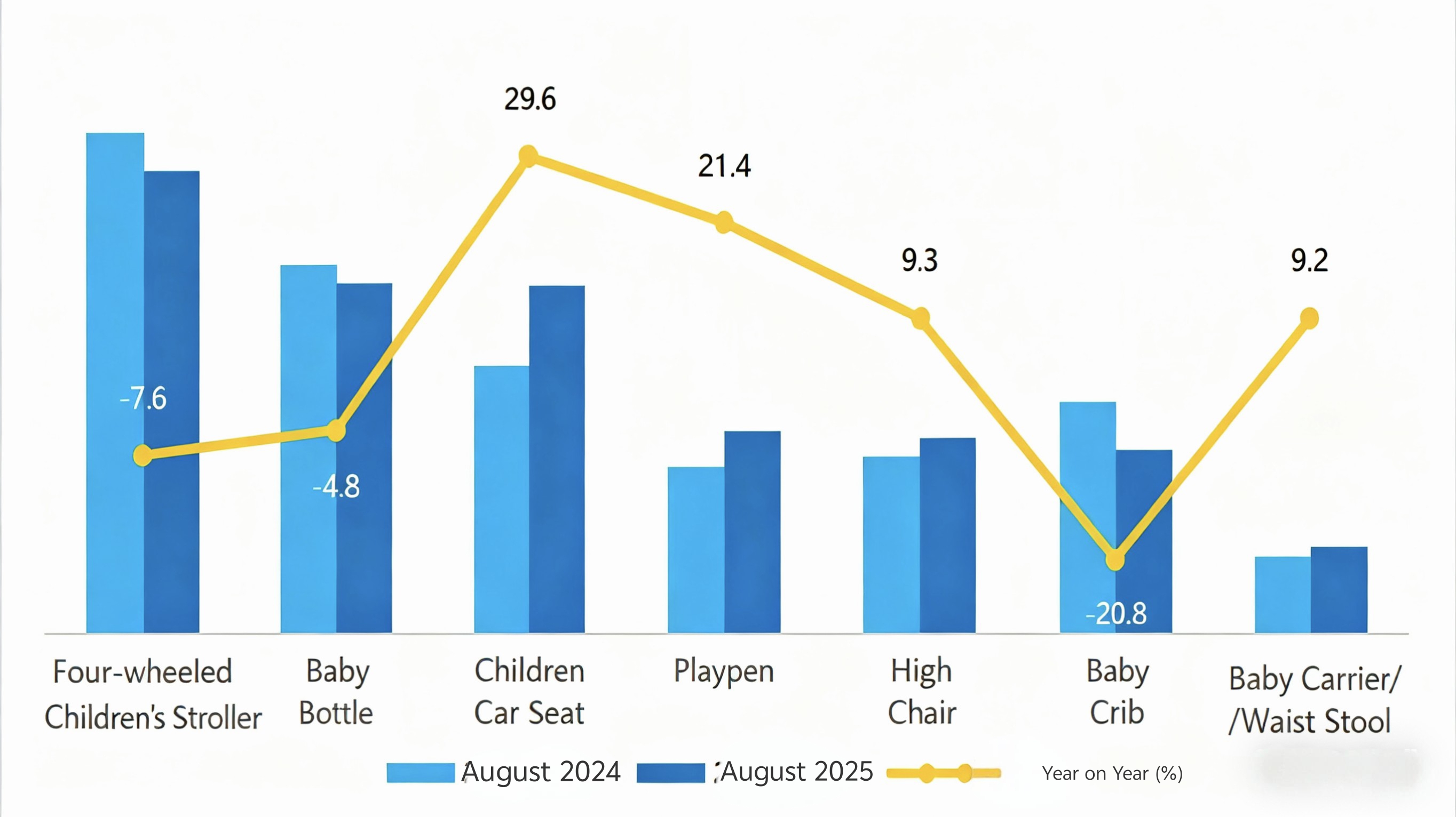In August, key baby product categories on Tmall saw notable sales growth year-over-year: children car seats (+29.6%), playpens (+21.4%), high chairs (+9.3%), baby carriers (+9.2%), electric ride-ons (+31.5%), and kids' bikes (+4.0%).